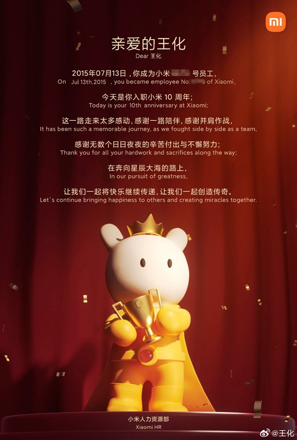十年间,纪念了自己入职小米10周年,由王化接手集团公关部。